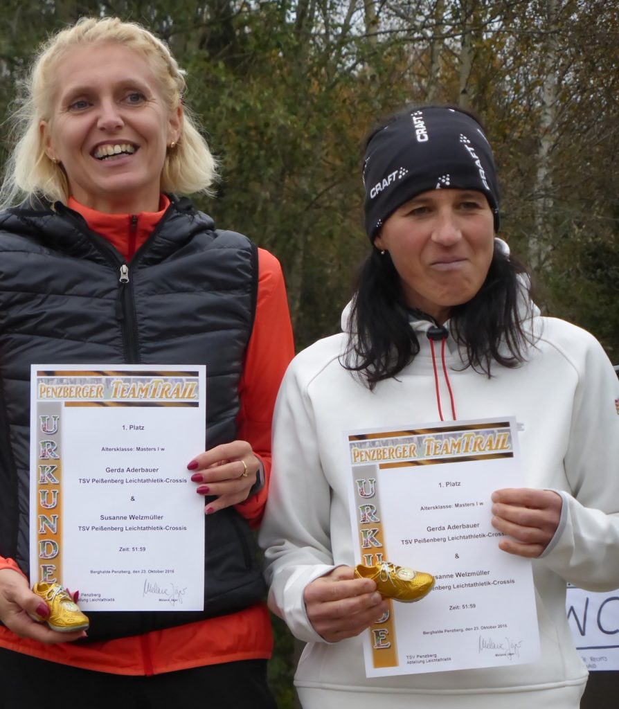 Die Strecke war bei den Erwachsenen also deutlich länger, ein paar schlammige Passagen und ein weiterer knackiger Anstieg kamen noch dazu. Über den Sieg und goldene Schuhe freuten sich nach 8 harten Runden der Masters I die Trainerinnen Gerda Aderbauer und Susi Welzmüller, die nach 51:59 Minuten ins Ziel kamen.