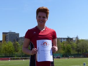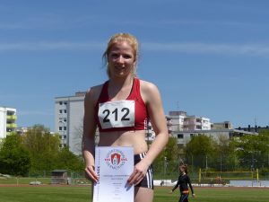 Beim Diskuswerfen übertraf Simone ihre alte Bestmarke (21,87 m) um Längen. Im ersten Versuch landete die Scheibe mit neuem Vereinsrekord bei 29,31 m und zwei weitere Würfe an die 29-m-Marke bestätigten diese Leistung. „So konstant hat sie noch nie geworfen, da fehlten nur ein paar Zentimeter zur A-Quali“, lobte Sabine die Serie. Platz 2 im Diskuswerfen bedeutete für Simone den dritten Podestplatz des Tages in der U20.