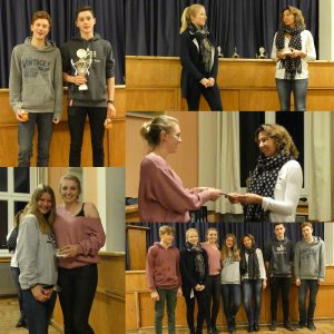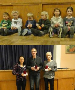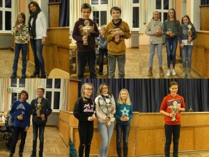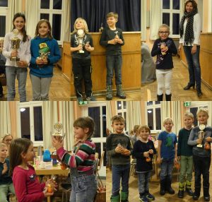 Jetzt werden die geehrten Sportler immer größer, Sabine überreicht die Pokale und abwechselnd strahlen Buben und Mädchen in die Kamera. Eine kleine Wegzehrung mit Mandarinen und Nüssen nehmen alle mit nach Hause.